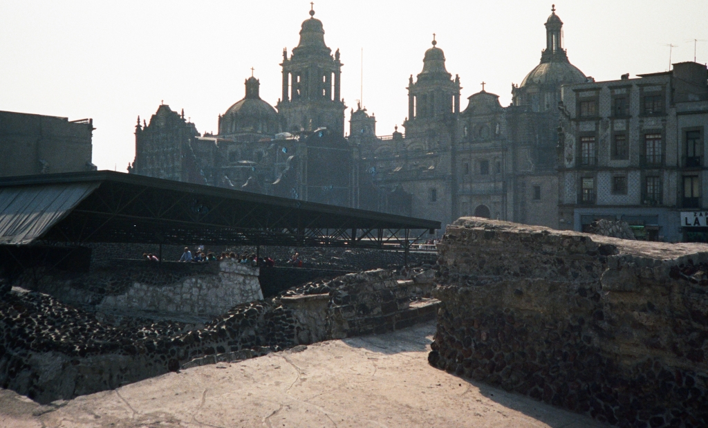 1986_12_16 (Dienstag) Mexico City: Frühstück in einer Cafeteria nahe dem Zocalo-Platz, tief im Innern eines Gebäudes. Rundgang durch das Ausgrabungsgebiet Templo Mayor. Zum Nationalpalast mit den berühmten Fresken von Diego Rivera. Calle Tacuba / Café Tacuba.