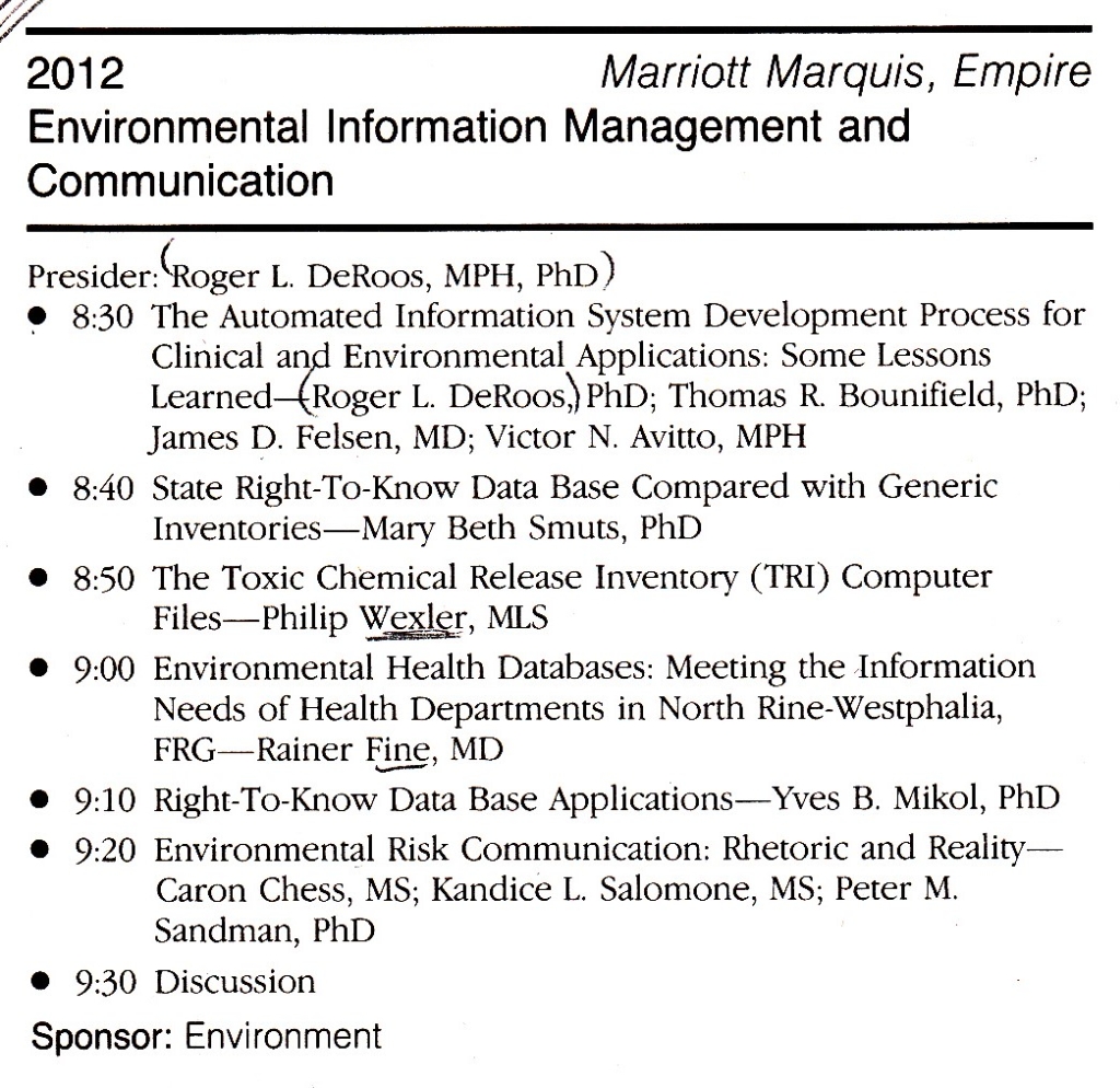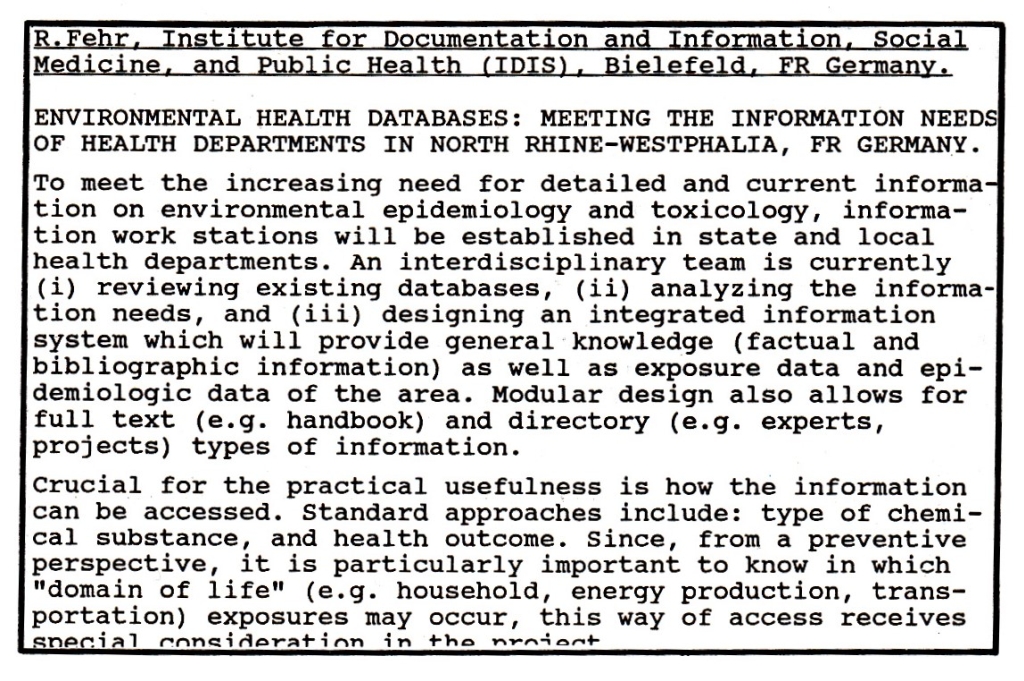 - R. Fehr: Environmental Health databases: Meeting the information needs of health departments in North Rhine-Westphalia. Abstract Book, p.82. Session 2012, Environmental Information Management and Communication. Marriot Marquis, Empire. Sponsor: Environment section, 2.10.1990, Program Book, p.86 [90-03]