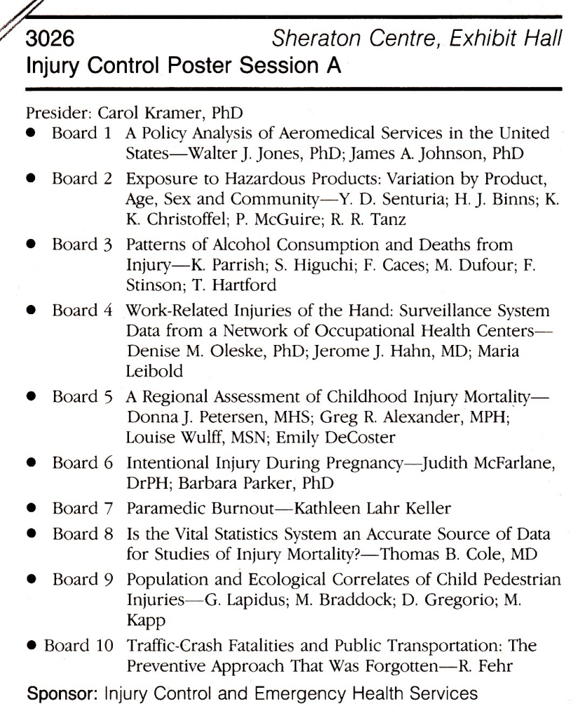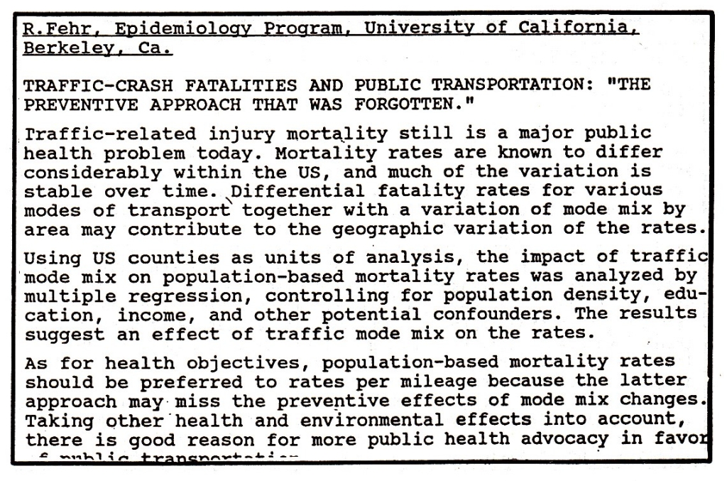 - R. Fehr: Traffic-crash fatalities and public transportation: “The preventive approach that was forgotten.” Abstract Book, p.198. Session 3026, Injury Control Poster Session A. Sheraton Centre, Exhibit Hall. Sponsor: Injury Control and Emergency Health Services section, 3.10.1990, Program Book, p.136 [90-04].