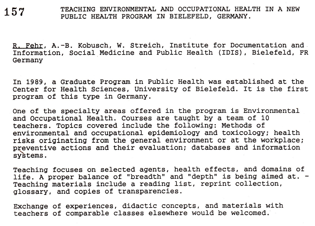 - Fehr R, Kobusch A-B, Streich W (1991): Teaching environmental and occupational health in a new Public Health program in Bielefeld, Germany. Poster presentation (#157) in General poster exhibition I / Allgemeine Posterausstellung I, Program booklet p.29 [91-03]