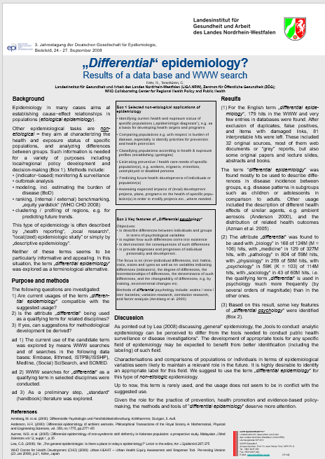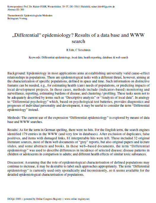 - Fehr, R., Terschüren, C. (2008): “Differential” epidemiology? Results of a database and WWW search. Poster-Präsentation in Poster-Session P3 – Methoden. Programmheft, p.27; Tagungsband, p.169 [07-20] Abstract, Poster