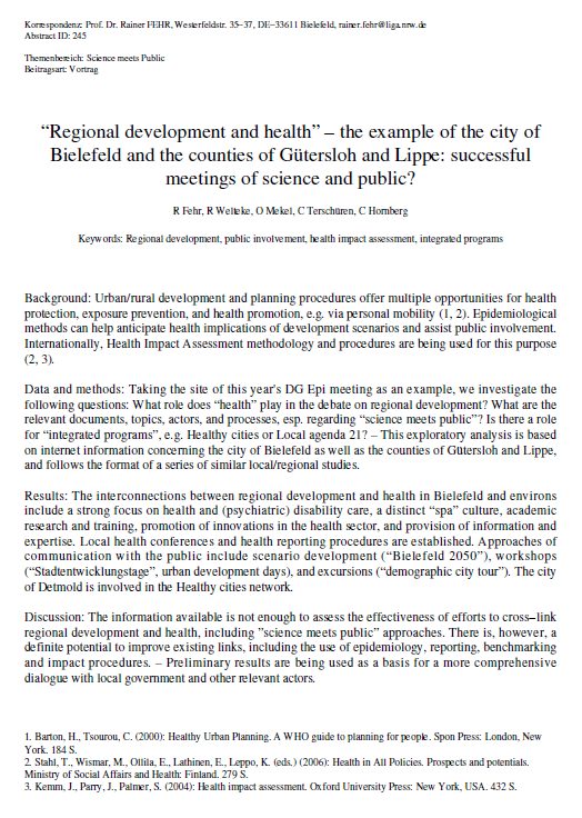 - Fehr, R., Welteke, R., Mekel, O., Terschüren, C., Hornberg, C. (2008): „Regional development and health“ – the example of the city of Bielefeld and the counties of Gütersloh and Lippe: successful meetings of science and public? Poster-Präsentation in Session P8 – Megacities – Freie Themen. Programmheft, p.36; Tagungsband, p.209 [08-25a] Abstract, Poster