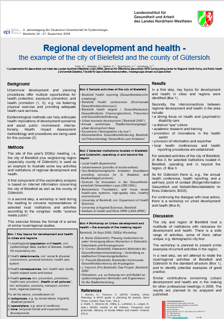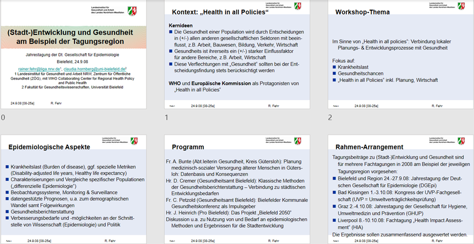 Workshop (Stadt-)Entwicklung und Gesundheit am Beispiel der Tagungsregion, organisiert von R. Fehr, LIGA.NRW, und C. Hornberg, U Bielefeld. Programmheft, p. 63 [08-25b]