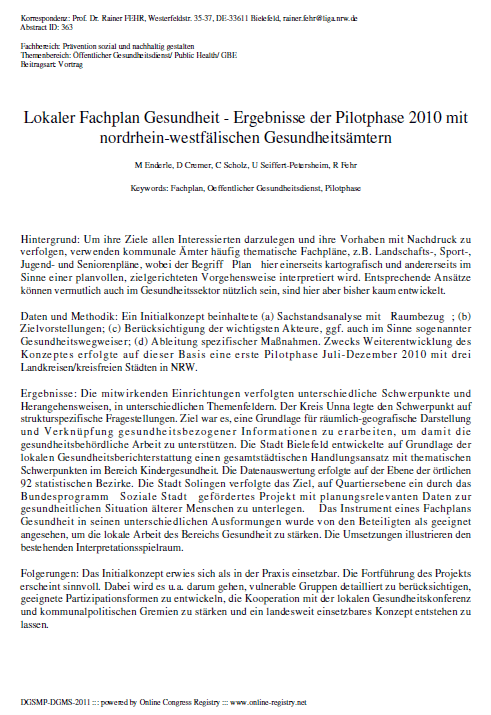 - Enderle M, Cremer D, Scholz C, Seiffert-Petersheim U, Fehr R: Lokaler Fachplan Gesundheit – Ergebnisse der Pilotphase 2010 mit nordrhein-westfälischen Gesundheitsämtern. Beitrag A363. Abstract: Das Gesundheitswesen 8/9 2011, p.552 [11-16]