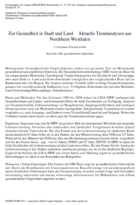 - Terschüren C, Annuß R, Fehr R: Zur Gesundheit in Stadt und Land – Aktuelle Trendanalysen aus Nordrhein-Westfalen. Beitrag A137. Abstract: Das Gesundheitswesen 8/9 2011, p.621 [11-20]