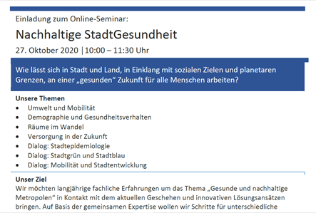 19.10.2020, Announcing: Online seminar “Sustainable Urban Health”, 27 Oct 2020 / Ankündigung: Online-Seminar “Nachhaltige StadtGesundheit” am 27.10.2020