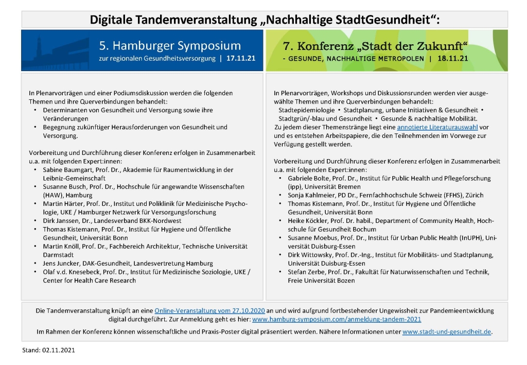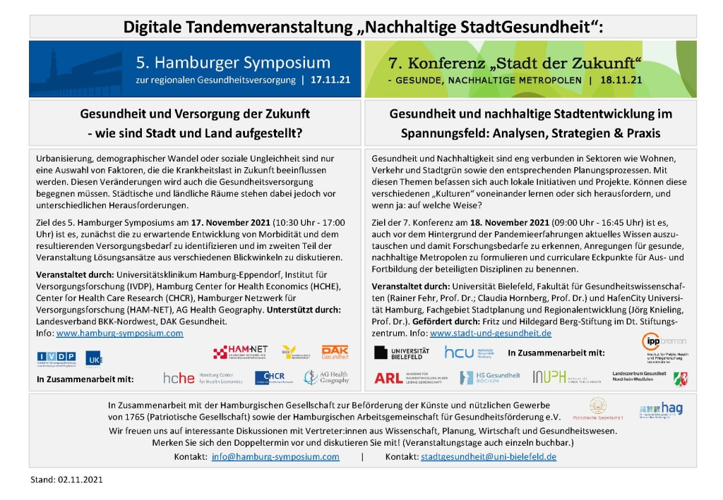 Die Konferenz wurde als Tandemveranstaltung durchgeführt. Das 5. Hamburger Symposium zur regionalen Gesundheitsversorgung, www.hamburg-symposium.com/, erfolgte am 17.11.2021 (10:30 Uhr – 17:00 Uhr) und behandelte das Thema: „Gesundheit und Versorgung der Zukunft – wie sind Stadt und Land aufgestellt?“