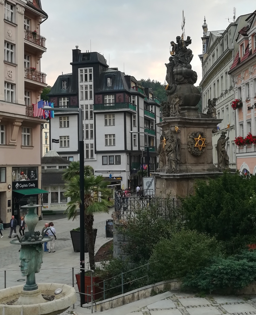 (2) Karlsbader Pestsäule, https://www.karlovyvary.cz/de/saeule-mit-statuengruppe-der-allerheiligsten-dreifaltigkeit: Säule mit Statuengruppe der Allerheiligsten Dreifaltigkeit – hochbarocke Dreifaltigkeitssäule aus Sandstein … Die Karlsbader errichteten sie aus Dankbarkeit, dass die Bäderstadt im Jahre 1713 von der damaligen … Pestseuche verschont blieb …