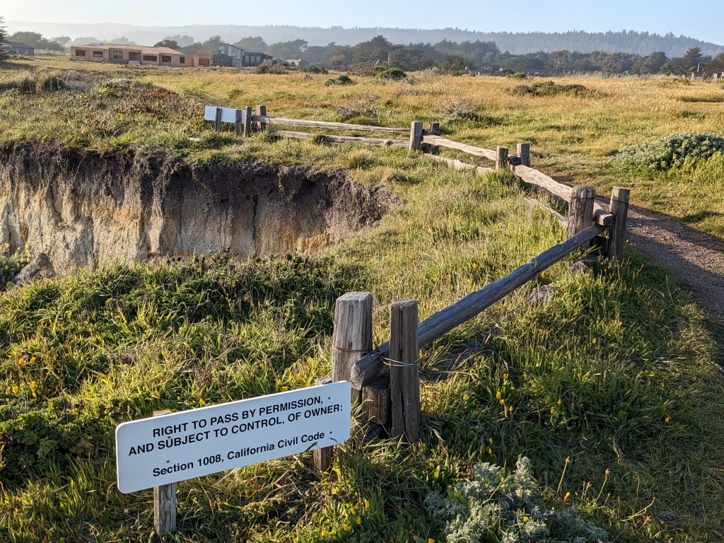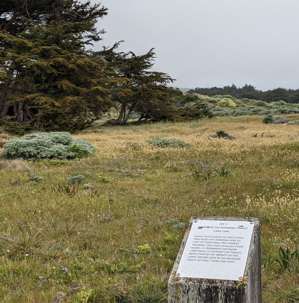 Local sign: „WW II Practice Bombing Target 1944-1946. Naval pilots based in Santa Rosa practiced dive bombing here as part of their final pre-combat training. They used Gualala Point Island, a prominent offshore land mass, to identify the target, which was in the vicinity of the large mound seen in the meadow about 50 yards from this spot.“