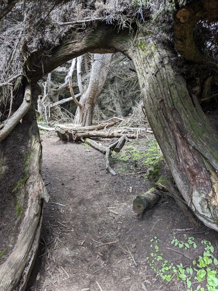 Salt Point (State Park), https://en.wikipedia.org/wiki/Salt_Point_State_Park (18.3.2023): … in Sonoma County … a rough rocky coastline … The constant impact of the waves forms the rocks into many different shapes … The native Kashaya Pomo collected salt from this area … They used abalone chisels to scrape the salt off the rocks … The eyebolts used to anchor ships down are still visible at Gerstle cove … sandstone and wood were loaded onto cargo ships … at an elevation of about … 168 m … within Salt Point State Park is a pygmy forest including the Mendocino cypress … The reason these trees do not attain their normal height is due to the highly acidic soils with minimal nutrients and a hardpan layer close to the surface … The rocks of Salt Point are sedimentary, mainly sandstone … The rocks at the north end of the park’s coast are younger than the rocks at the southern end. Salt Point is named for the tafoni where the ocean water crystallizes in the honeycomb like crevices. This tafoni is caused when the salt crystals interact with the sandstone making parts of the sandstone harden while other parts soften …