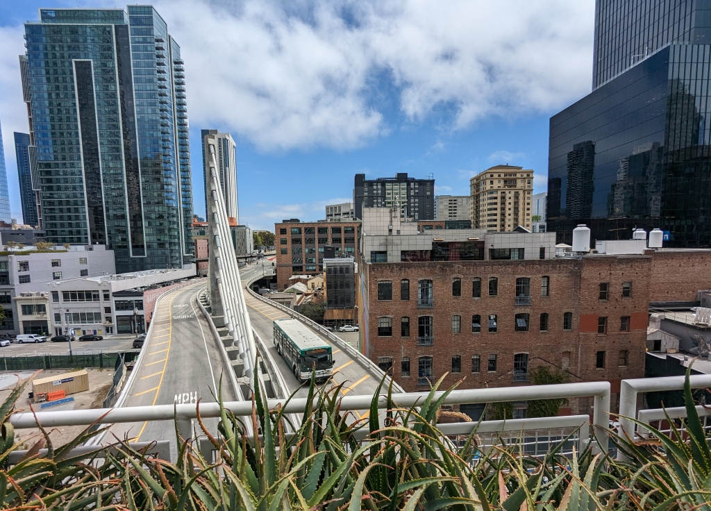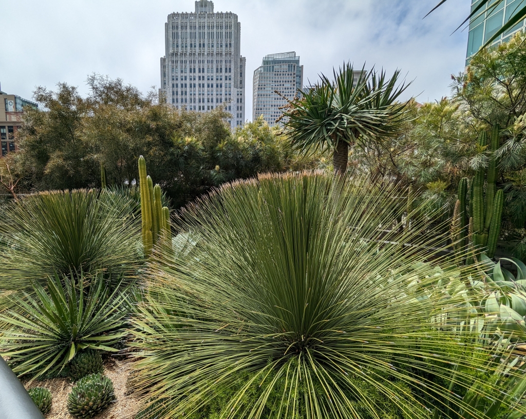 From the signage: Mediterranean gardens of the world … Mediterranean climate biomes … diversity of plant life … represented here … Cork oak … … Bus fountain … registers the movement of buses … on the Bus Deck below the park … … Yoga – Fridays … At the Amphitheater … … Midday Music – Saturdays … At the Central Lawn …