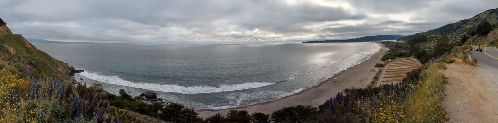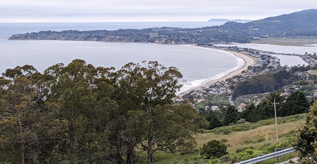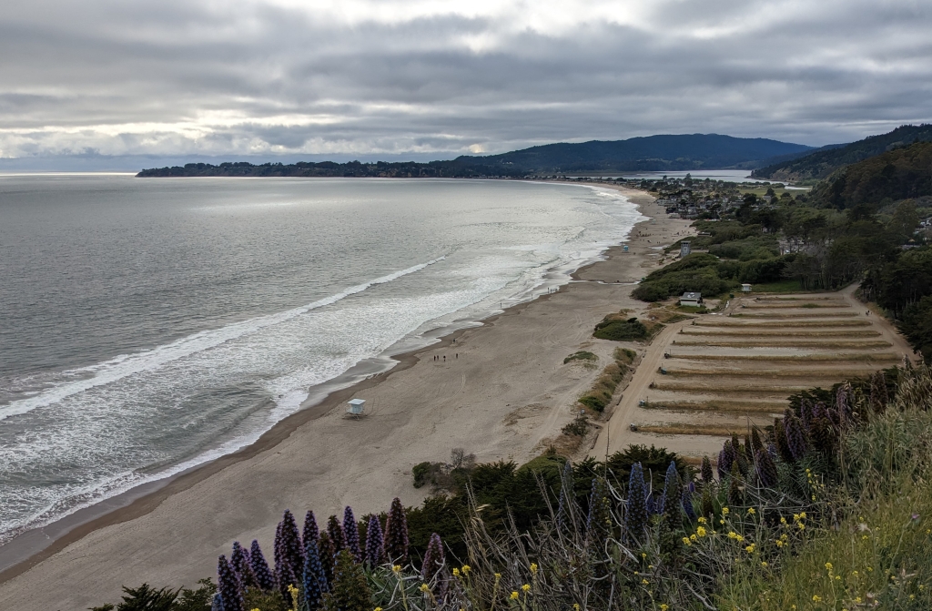 Stinson Beach, https://en.wikipedia.org/wiki/Stinson_Beach,_California: … 4 km … east-southeast of Bolinas … the cold water produces fog throughout the year … The beach is … sandy, unlike the rockier neighboring beach in Bolinas … The surf off Stinson Beach is within an area known as the Red Triangle, where there have been an unusually high number of shark attacks … Notable people … Klaus Kinski …
