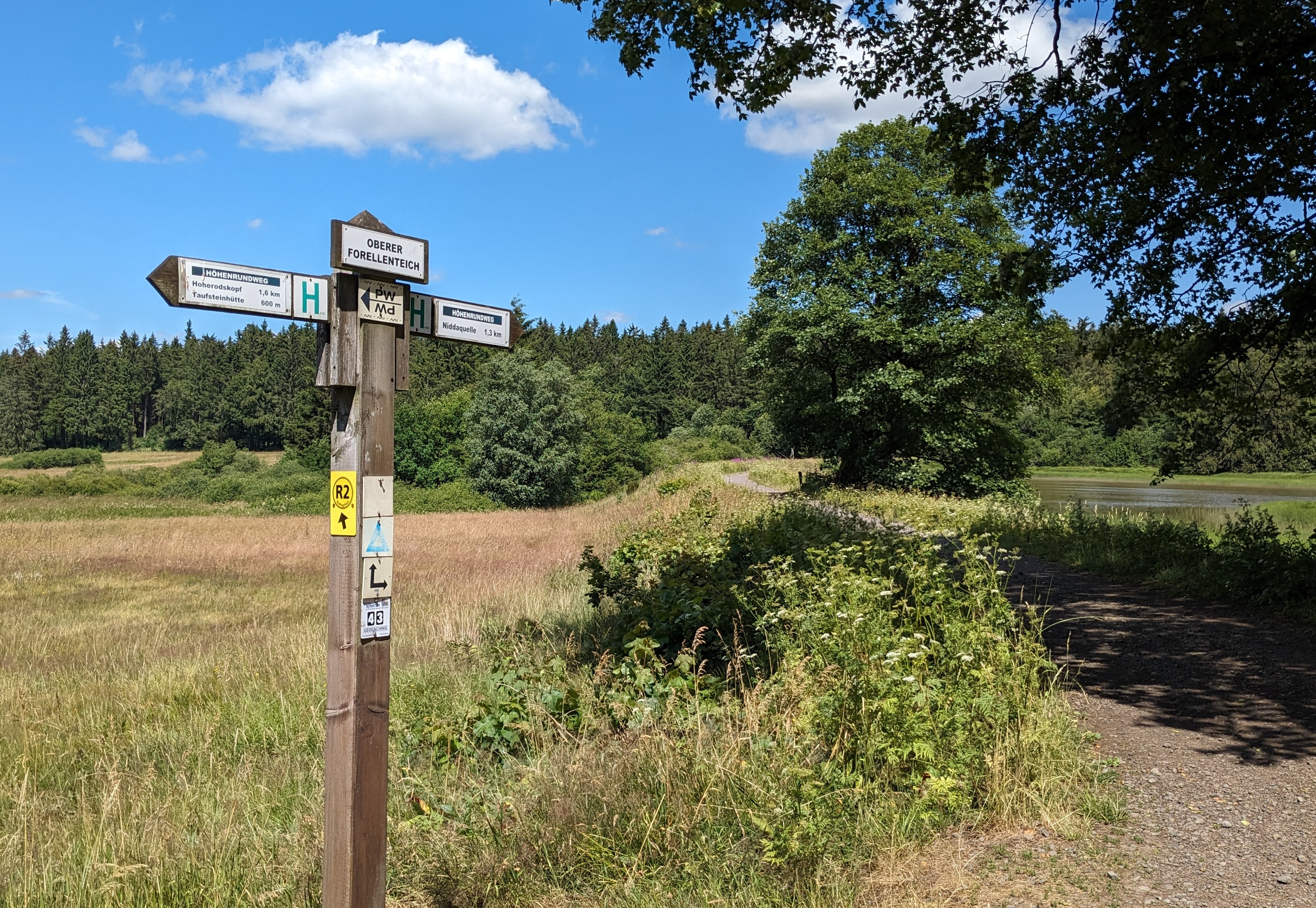 Hoherodskopf, https://de.wikipedia.org/wiki/Hoherodskopf: … mit 763,8 m ü. NHN … der zweithöchste Gipfel im Mittelgebirge Vogelsberg … im hessischen Vogelsbergkreis … gute Fernsichtmöglichkeiten … Bis auf die Gipfelregion … reichen Teile des vielteiligen Fauna-Flora-Habitat-Gebiets Hoher Vogelsberg … Vom Gipfel … Fernsicht bis in das Rhein-Main-Gebiet und zum Taunus …
