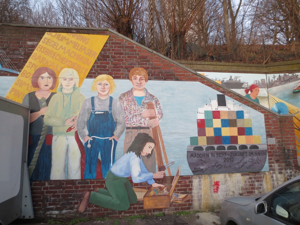 The mural “Girls in view – Their future in the port” (Hamburg, Große Elbstraße 210) from 2012 deals with the vocational and career chances for women in the skilled crafts and technical jobs in the port of Hamburg. Adequate job positions are known to foster good health. – Nine school girls created the mural under the artistic guidance of Hildegund Schuster. The Frauen Freiluft Galerie (Women open air gallery) has been in existence since 1994 as a long-term project, www.frauenfreiluftgalerie.de/en/maedchen.php.
