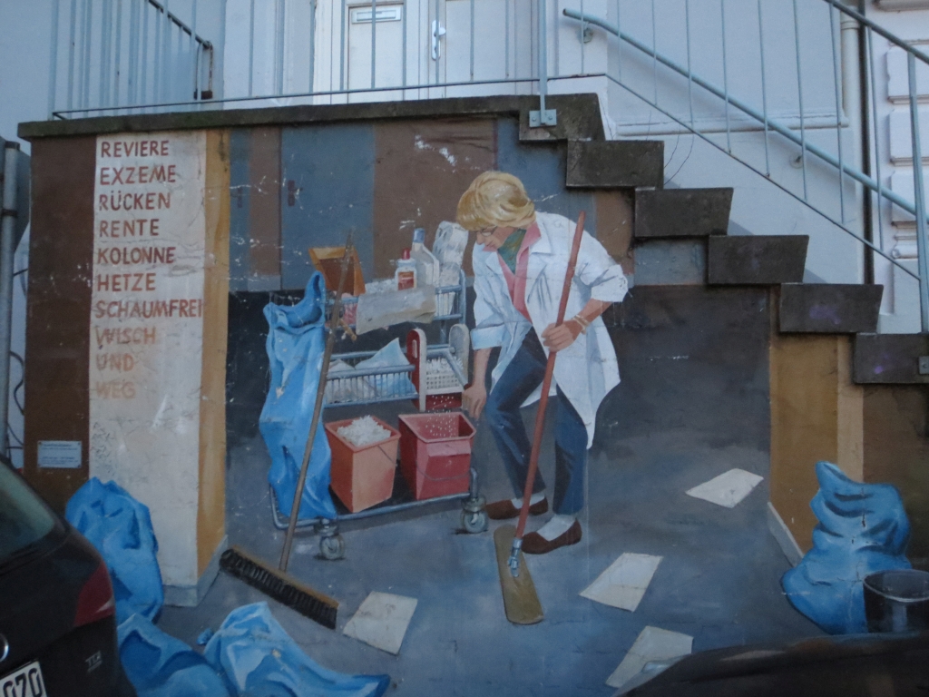The mural “Wipe and swish – the cleaning ladies” (Hamburg, Große Elbstraße 164) from 1997 addresses the “typical woman’s work” of cleaning. Outsourcing and marginalization, however, are not limited to cleaning work, they continue to be a societal challenge. The words listed on the left accentuate the topic of the mural, including eczema, backache, pension, gang, stressful rush, foam-free, wipe and swish. – Artist: Hildegund Schuster. The Frauen Freiluft Galerie (Women open air gallery) has been in existence since 1994 as a long-term project, www.frauenfreiluftgalerie.de/en/putzfrauen.php.