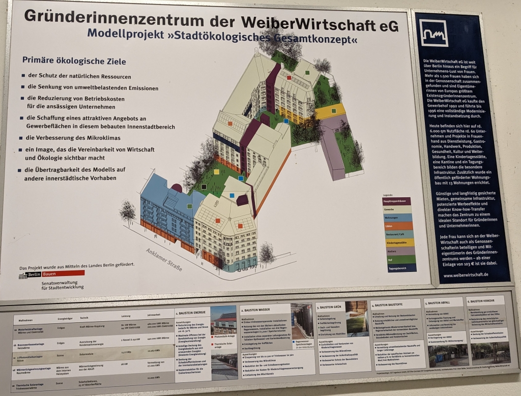 https://dev22.weiberwirtschaft.de/informieren/gruenderinnen-und-unternehmerinnenzentrum/#c1986: Ökologie – Die WeiberWirtschaft eG hat mit der Sanierung ihrer Immobilie Anfang der 1990er Jahre Zeichen gesetzt … die „Erste ökologische Gewerbehofsanierung in Berlin“ durchgeführt und setzt auch im laufenden Geschäftsbetrieb nachhaltige Standards. Die baulichen Maßnahmen umfassen die Bereiche