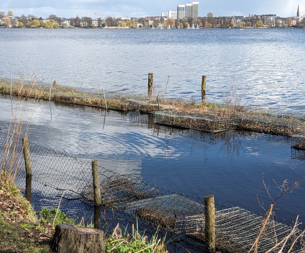 Infotafel “Lebensräume für die Außenalster”: “Die letzten natürlichen Schilfgürtel an der Außenalster wurden in den [19]50er Jahren abgebaggert, um mehr Platz für den Segelsport zu schaffen. In den [19]80er Jahren gab es dann erste Versuche, wieder Röhrichte anzupflanzen. Nicht überall sind die neuen Röhricht-Pflanzen gut angewachsen. Das liegt auch an den vielen Wasservögeln … hat das Projekt “Lebendige Alster” im August 2022 große Flächen schwimmender Pflanzeninseln mit Schutzgittern … platziert … getestet – mit positiver Wirkung …”, https://www.lebendigealster.de/
