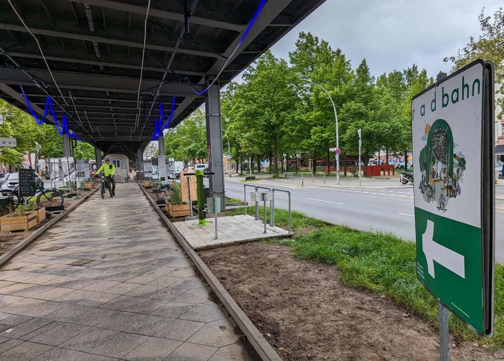 Senatsverwaltung für Stadtentwicklung, Bauen und Wohnen (Berlin): Reallabor Radbahn, www.berlin.de/sen/stadtentwicklung/quartiersentwicklung/programme/nationale-projekte-des-staedtebaus/reallabor-radbahn/: Förderzeitraum 2019 bis 2023. Gesamtkosten 3,3 Mio. €, davon Förderung Bund: 2,2 Mio. €, … Förderung Berlin: 1,1 Mio. € / [transl.] Funding period 2019 to 2023. Total costs € 3.3 million, incl. federal funding: € 2.2 million, … Berlin funding: €1.1 million.