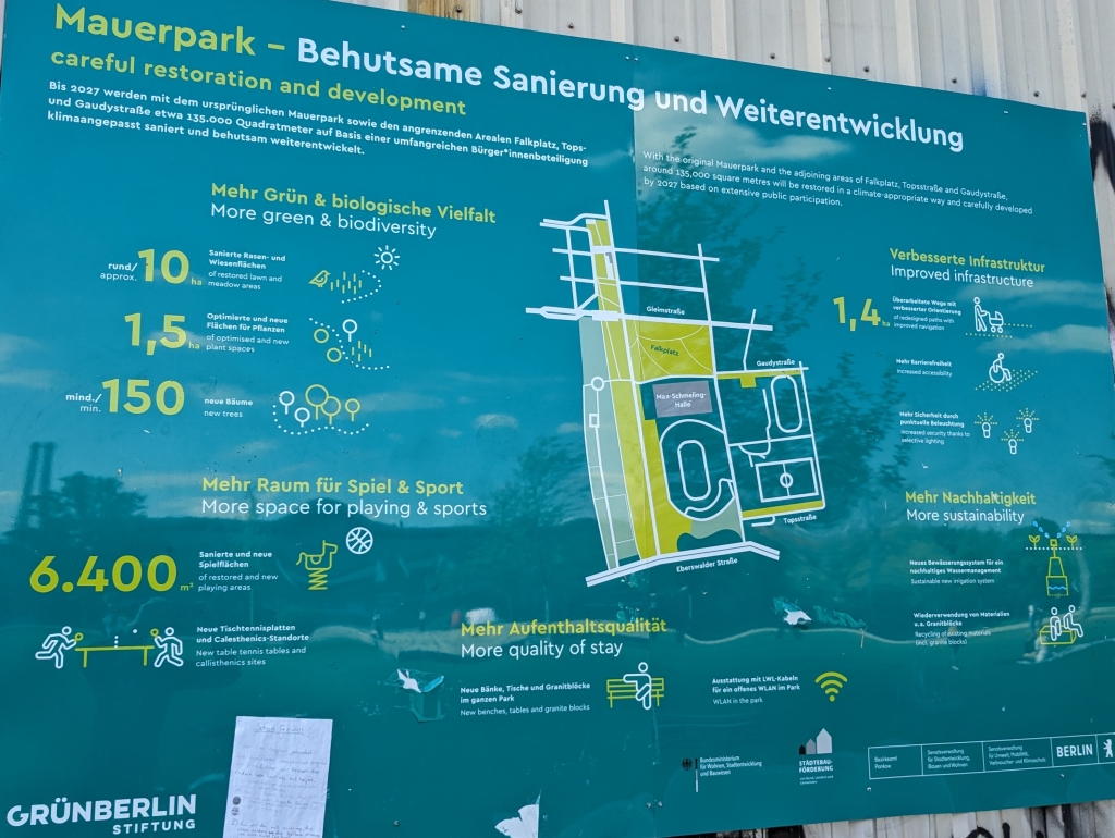 (1) Berliner Mauerpark, https://de.wikipedia.org/wiki/Mauerpark: … in Berlin-Prenzlauer Berg. Von Bürgerinitiativen 1990 erstmals bepflanzt, 1994 nach Plänen von Gustav Lange eröffnet und bis 2020 mehrfach erweitert, folgt der Park dem Verlauf der ehemaligen Berliner Mauer entlang der Schwedter Straße … zählt der Mauerpark mit … Flohmarkt und … Straßenmusikern zu den beliebtesten Sehenswürdigkeiten Berlins … Bau und Erweiterung … waren über Jahrzehnte hinweg ein komplexes politisches Konfliktfeld verschiedener Bürger- und Verwertungsinteressen … liegt gut zwei Kilometer nördlich des Roten Rathauses im Gleimviertel (Ortsteil Prenzlauer Berg, Bezirk Pankow) … Im Norden verläuft die Ringbahn … Im Süden liegen Bernauer Straße und Eberswalder Straße … erstreckt sich der Park über knapp einen Kilometer Länge in Nord-Süd-Richtung … Teil des Grünen Bandes Berlin … grenzt im Norden an das Landschaftsschutzgebiet Nr. 52 “Ehemaliger Mauerstreifen, Schönholzer Heide und Bürgerpark” … Überreste der Berliner Mauer … nur wenige erhalten: Oben auf der Stadionböschung steht ein 300 m langes Stück der Hinterlandsicherungsmauer, … am Parkeingang Bernauer Straße ist in einem archäologischen Fenster das Fundament einer Fahrzeugsperre freigelegt … in der Pflasterung der Schwedter Straße … entlang der Westseite zahlreiche Fundamente von Pfeilern einer alten Grenzsicherungsanlage markiert … An der Eberswalder Straße steht auf dem Gelände des Hundeauslaufs ein einzelner, großer Lichtmast der ehemaligen Grenzanlage … Soziale Nutzung … Berliner Lebensgefühl … Der „Sonntag im Mauerpark“ galt verbreitet als Beispiel für ein „Berliner Lebensgefühl“: einem „aus Unterdrückung entstandenen Klima der Akzeptanz und zwanglosen Freiheit“: „There is perhaps no better example of Berlin’s climate of acceptance and freewheeling freedom born from repression than Sundays in Mauerpark“ – The New York Times, 2017 …