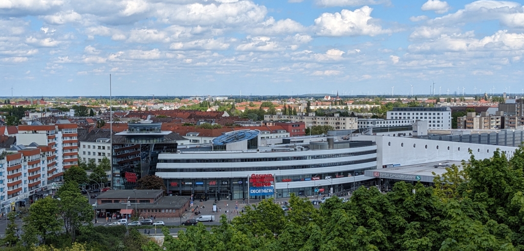 (2) Humboldthöhe im Humboldthain, https://de.wikipedia.org/wiki/Humboldth%C3%B6he: Die Humboldthöhe ist einer der Trümmerberge, die nach dem Zweiten Weltkrieg in Berlin aus Kriegsschutt aufgeschüttet wurden. Er ist 84,5 m … hoch, bewaldet und Teil des im Bezirk Mitte gelegenen Volksparks Humboldthain. … im Ortsteil Gesundbrunnen … Er erhebt sich im Norden des Volksparks Humboldthain – etwa 300 m südwestlich des Bahnhofs Berlin Gesundbrunnen … – Volkspark Humboldthain, https://de.wikipedia.org/wiki/Volkspark_Humboldthain: … steht als Gartendenkmal unter Schutz …