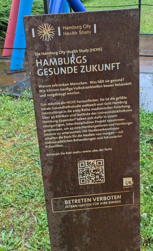 Infotafel: „Die Hamburg City Health Study (HCHS). Hamburgs Gesunde Zukunft. Warum erkranken Menschen. Was hält sie gesund? Wie können häufige Volkskrankheiten besser behandelt und vorgebeugt werden. Das möchte die HCHS herausfinden. Sie ist die größte lokale Gesundheitsstudie weltweit und rückt Hamburg international in die erste Reihe medizinischer Forschung. Über 30 Kliniken und Institute des … [UKE] habe sich dafür in einem … interdisziplinären Projekt zusammengeschlossen, um 45.000 Hamburgerinnen und Hamburger intensiv zu untersuchen. Die Studienerkenntnisse schaffen die Basis für die Medizin von morgen – mit individualisierten Behandlungen und fokussierter Prävention … www.uke.de/hchs