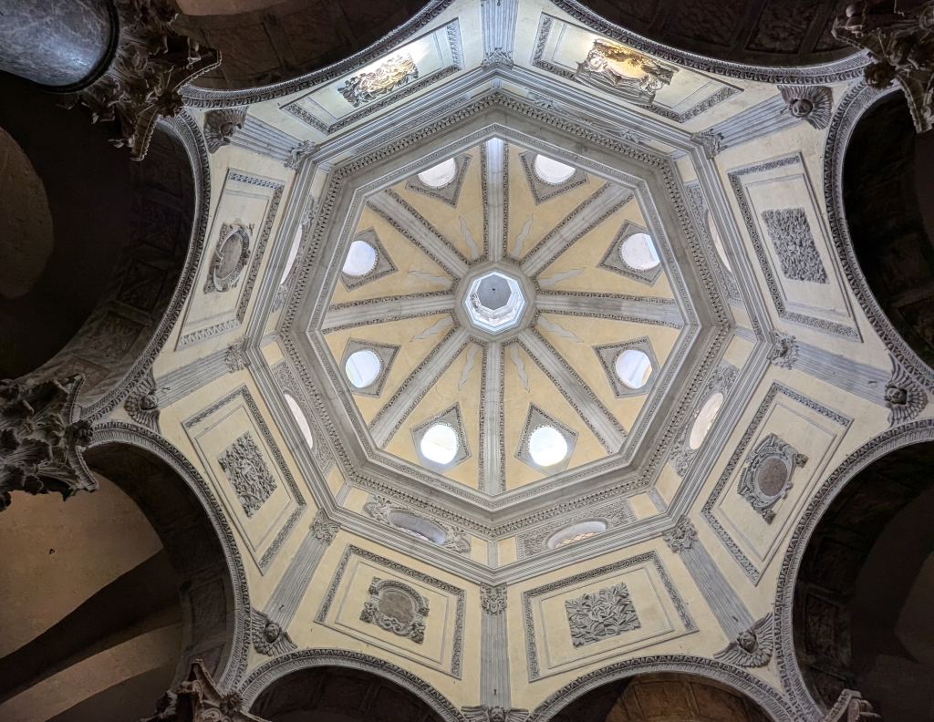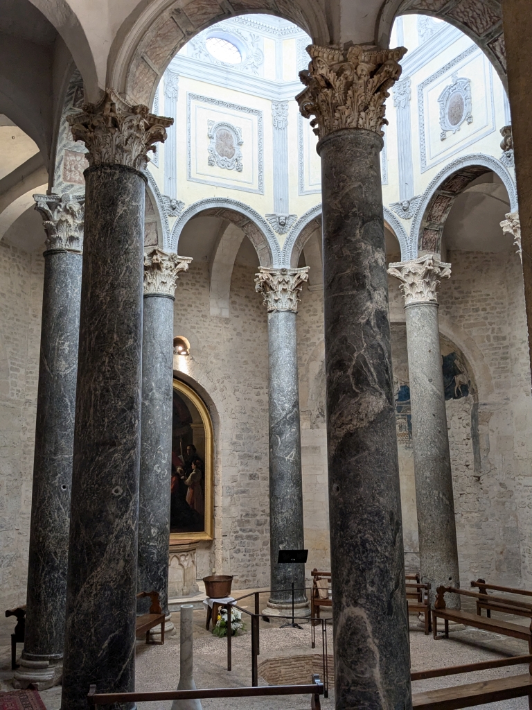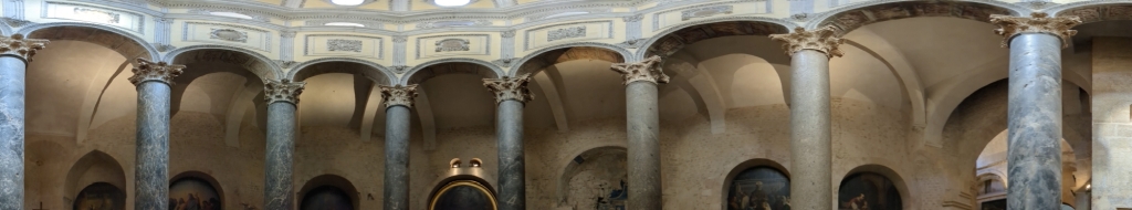 Cathédrale Saint Sauveur, https://en.wikipedia.org/wiki/Aix_Cathedral: … built on the site of the 1st-century Roman forum of Aix … includes Romanesque, Gothic and Neo-Gothic elements, as well as Roman columns and parts of the baptistery from a 6th-century Christian church … Only the octagonal baptismal pool and the lower part of the walls remain from that period. The other walls and the dome were rebuilt in the Renaissance … The columns are probably from a Roman temple that stood on the same site …