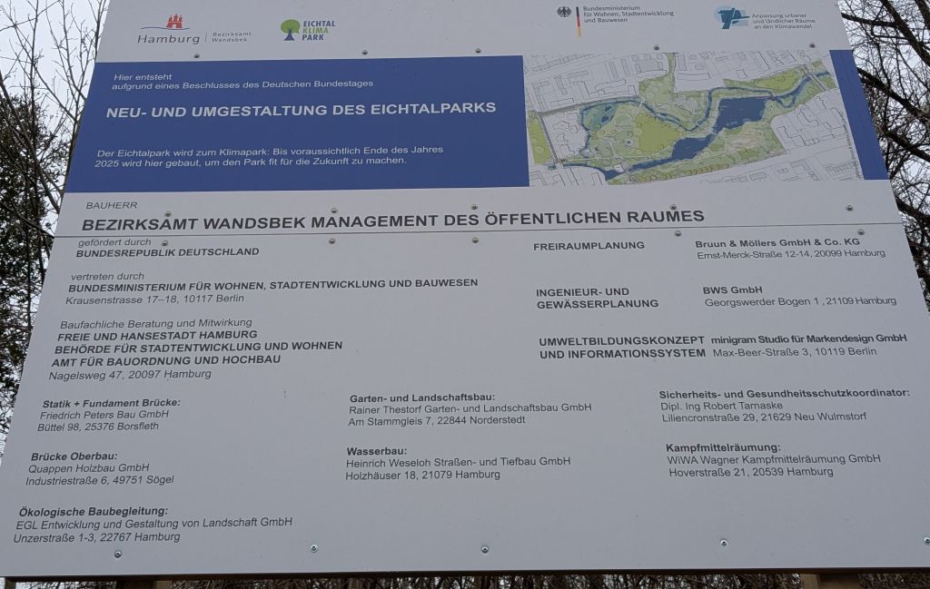 - Eichtalpark mit Kultorhaus (Wandsbek), www.hamburg.de/politik-und-verwaltung/bezirke/wandsbek/themen/umwelt-natur-und-klimaschutz/eichtal-klima-park: Der Eichtalpark … wird zum Klimapark: Bis voraussichtlich Mitte 2025 startet das Bezirksamt Wandsbek eine Vielzahl von Maßnahmen, die den Park auf den Klimawandel vorbereiten … soll. Unter anderem wird die Wandse renaturiert, eine Auenlandschaft angelegt, ein informativer Klimapfad geschaffen und an einer Klimastation über den Klimawandel informiert … Vorbildcharakter über Wandsbek und Hamburg hinaus … vom Bund und der Freien und Hansestadt Hamburg mit gut 3,73 Millionen Euro gefördert.