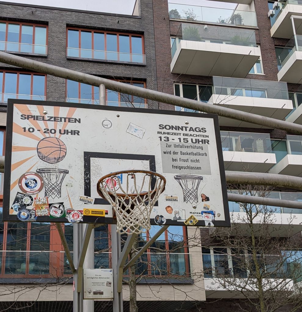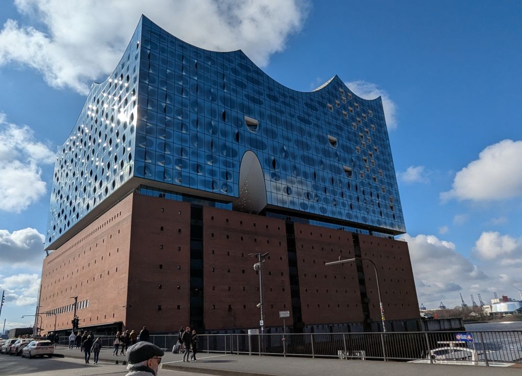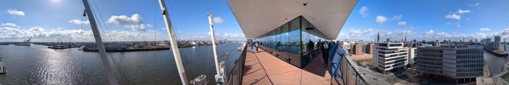 Elbphilharmonie, https://de.wikipedia.org/wiki/Elbphilharmonie: … 2016 fertiggestelltes Konzerthaus … am rechten Ufer der Norderelbe … zwischen den Mündungen der Hafenbecken Sandtorhafen und Grasbrookhafen … unter Einbeziehung der Hülle des früheren Kaispeichers A (Baujahr 1963) errichtet … Aufbau mit einer Glasfassade … Das Gebäude hat 26 Geschosse, wobei es vom Erdgeschoss bis zur Plaza im achten Obergeschoss von der Fassade des Kaispeichers A umschlossen wird, eines ehemaligen Kakao-, Tee- und Tabakspeichers … am höchsten Punkt … eine Höhe von rund 110 Metern … Öffentlicher Raum: Die Plaza. Zwischen Backsteinsockel und Glasaufbau befindet sich in 37 Metern Höheein öffentlich zugänglicher Platz, der als Zugangsebene für das Foyer der Konzertsäle und zum Hotel dient. Teil der Plaza ist ein Außenrundgang um das gesamte Gebäude … Aussicht über die Norderelbe, den Hafen, HafenCity und die Innenstadt … / (DeepL translation) … concert hall completed in 2016 … on the right bank of the Norderelbe … between the mouths of the Sandtorhafen and Grasbrookhafen harbor basins … built using the shell of the former Kaispeicher A (built in 1963) … superstructure with a glass façade … The building has 26 storeys, whereby it is enclosed from the first floor to the plaza on the eighth floor by the façade of Kaispeicher A, a former cocoa, tea and tobacco warehouse … at the highest point … a height of around 110 meters … Public space: The plaza. Between the brick base and the glass superstructure, at a height of 37 meters, there is a publicly accessible plaza that serves as an access level for the foyer of the concert halls and the hotel. Part of the plaza is an outdoor walkway around the entire building … View over the Norderelbe, the harbor, HafenCity and the city center …
