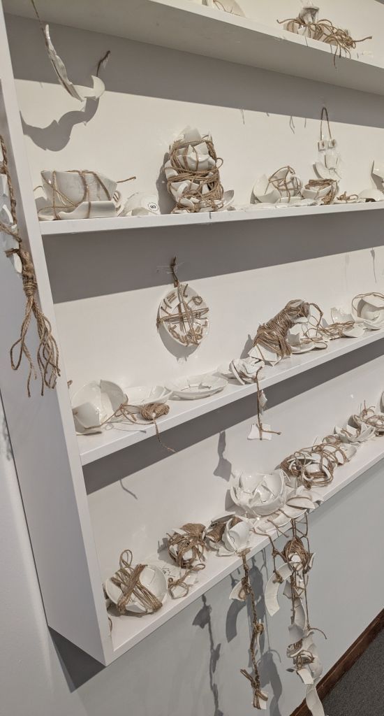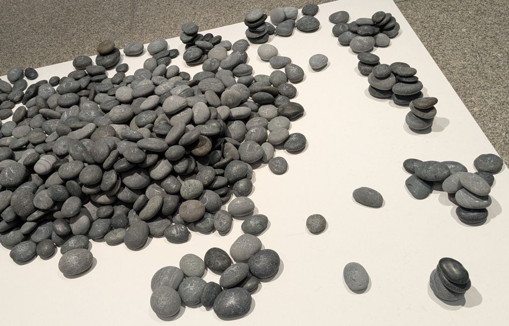 - Vor dem Betreten der Ausstellung werden die Besucher*innen eingeladen, sich mit „Cleaning Piece“ (1996) auf einen Moment der Selbstreflexion einzulassen. Das Sortieren von Flusssteinen aus der Region soll zum Nachdenken über die eigenen Freuden und Sorgen anregen … In „Mend Piece“ (1966) beteiligt sich das Publikum an einem Akt des Reparierens: Hier können zerbrochene tönerne Tassen zusammengefügt und mit „Weisheit und Liebe wiederhergestellt“ werden … Installation „Play It By Trust“ (1966/1991), ein großer Schachtisch, an dem sich … Spieler*innen … der fast unmöglichen Aufgabe widmen können, mit ausschließlich weißen Schachfiguren … zu spielen. Die Anweisung lautet, „so lange zu spielen, wie Sie noch wissen, wo die eigenen Figuren stehen“ / Before entering the exhibition, visitors are invited to engage in a moment of self-reflection through Cleaning Piece (1996). Piles of local river stones are arranged, prompting visitors to reflect on their joys and sorrows … In Mend Piece (1966), visitors take part in an act of repair, piecing together broken ceramic cups and “mending with wisdom and love.” The … installation, Play It By Trust (1966/1991), features a large chess table where … players can … engage in the nearly impossible act of playing with all white chess pieces, challenging them to “play as long as you remember where all your pieces are.”