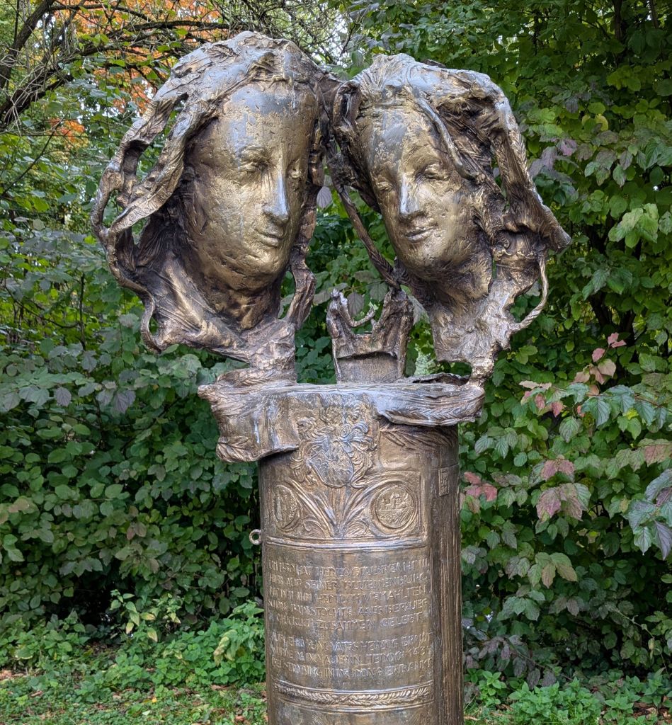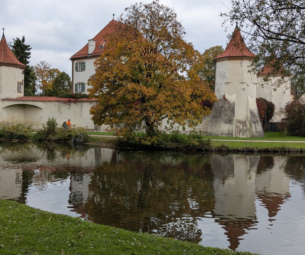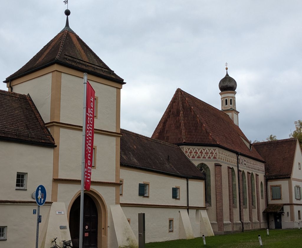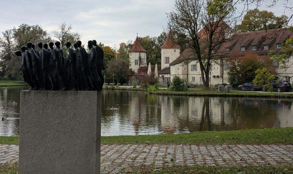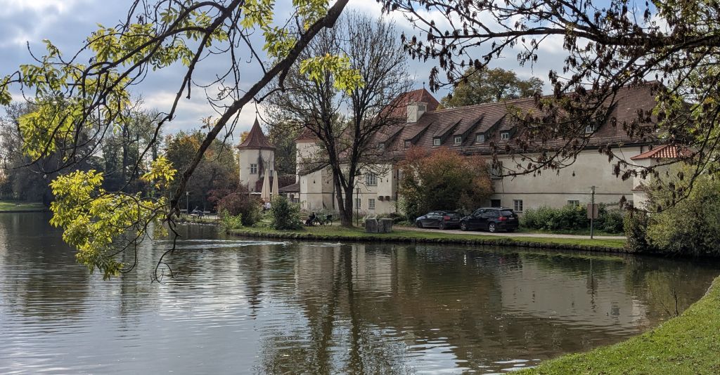 https://de.wikipedia.org/wiki/Schloss_Blutenburg: … ehemalige Jagdschloss Blutenburg … im Westen Münchens, im Stadtteil Obermenzing … Das spätgotische Bauwerk und die … Schlosskapelle werden von der Würm umflossen. Heute ist im Schloss u. a. die … Internationale Jugendbibliothek untergebracht. Hier hat auch die Erich-Kästner-Gesellschaft ihren Sitz … Schloss Blutenburg war durch eine Sichtachse … mit dem östlich gelegenen Schloss Nymphenburg verbunden … soll … mittelfristig wiederhergestellt werden. … Das Schloss geht auf eine Wasserburg des 13. Jahrhunderts zurück … … In der Nähe des Schlosses … ein Mahnmal des Bildhauers Hubertus von Pilgrim für die Opfer des Todesmarsches aus dem Konzentrationslager Dachau. Dieses Mahnmal gehört zu einer Reihe von 22 gleichen Mahnmalen, die seit 1989 aufgestellt wurden …