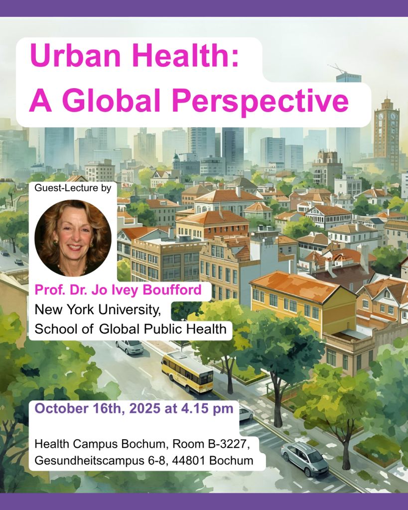 The visit took place 15-16 October 2025 in Bochum and Witten. On behalf of the research program’s advisory board, Heike Köckler (Bochum) and Rainer Fehr (Bielefeld/Hamburg) welcomed the guest. Dr. Boufford’s guest lecture “Urban Health: A Global Perspective” was preceded by visits to the city of Witten and to the NRW Landesamt für Gesundheit und Arbeitsschutz / NRW State Office for Health and Occupational Safety (LfGA). In Witten, on the occasion of this visit, Klaus Völkel as coordinator of “Healthy City Witten” had convened a group representing a variety of urban health activities. This involves “Health in All Policies” as well as the sustainability – health nexus. The meeting took place in the “B63” centre for urban culture. In the LfGA, Dr.s Odile Mekel and Thomas Claßen from the Division Health literacy and community health promotion presented on “Implementing Health in Planning in North Rhine-Westphalia – a long way to go”. [25-09]