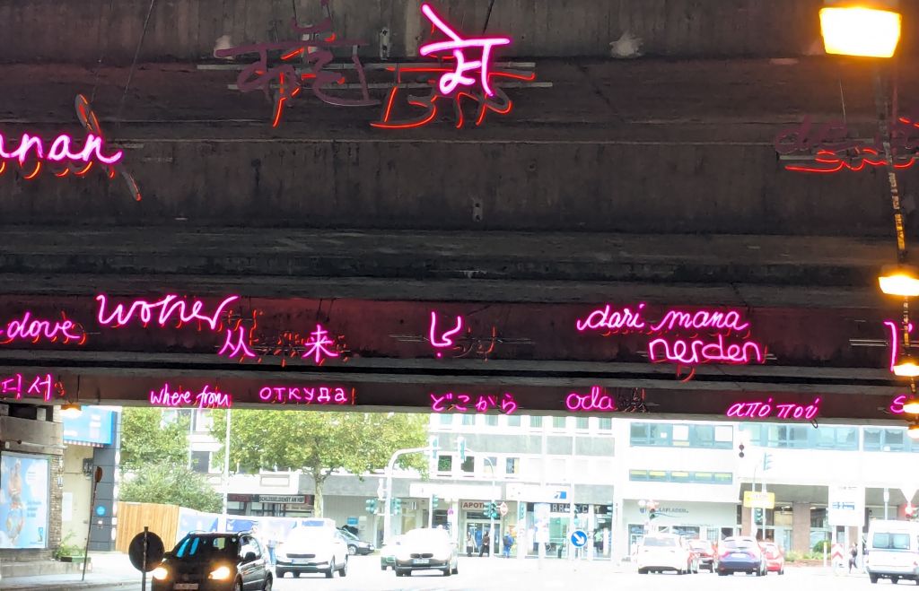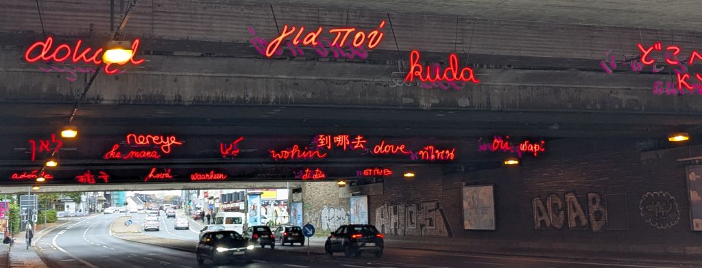 Uepo.de Übersetzerportal, 24.1.2025, Richard Schneider, https://uepo.de/2025/01/24/woher-wohin-bochumer-unterfuehrung-stellt-wesentliche-fragen-des-seins-in-24-sprachen/: Woher? Wohin? Bochumer Unterführung stellt wesentliche Fragen des Seins in 24 Sprachen / [Transl.] Where from? Where to? Bochum underpass poses fundamental questions of existence in 24 languages