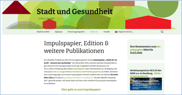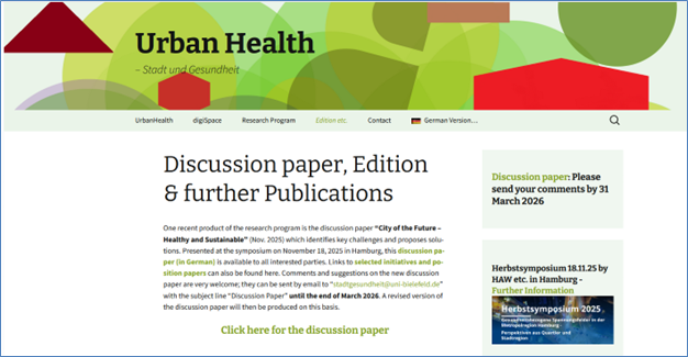Kommentare und Anregungen zum neuen Impulspapier sind sehr willkommen; sie können bis Ende März 2026 per Email an „stadtgesundheit@uni-bielefeld.de“ mit dem Betreff „Impulspapier“ gesandt werden. Auf dieser Basis soll dann eine revidierte Fassung des Impulspapieres entstehen / Comments and suggestions on the new discussion paper are very welcome; they can be sent by email to “stadtgesundheit@uni-bielefeld.de” with the subject line “Discussion paper” until the end of March 2026. A revised version of the discussion paper will then be produced on this basis. [24-14]
