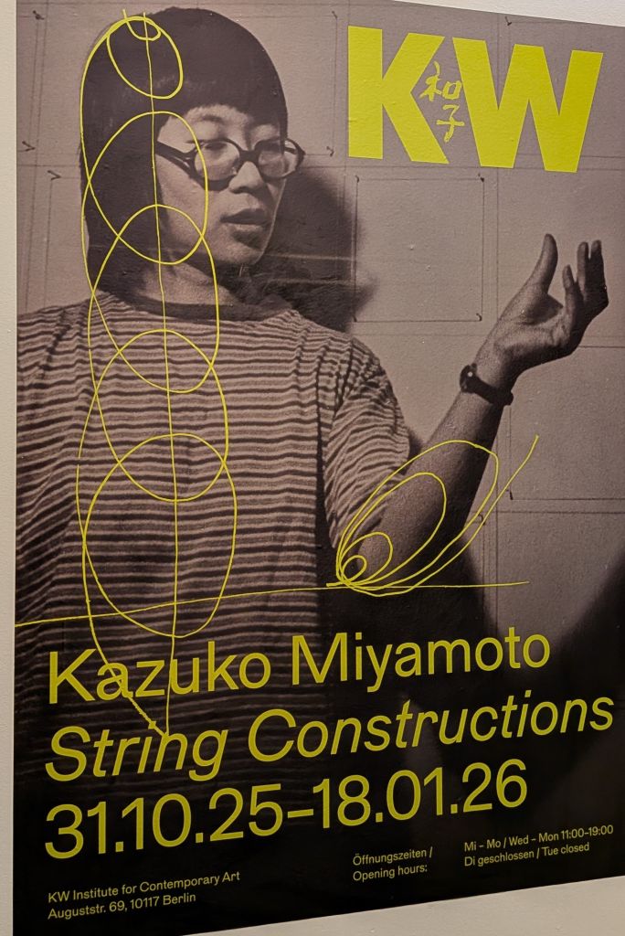 https://www.kw-berlin.de/en/exhibitions/kazuko-miyamoto: … the first institutional solo presentation in Germany devoted to the work of Kazuko Miyamoto (b. 1942, JP), a leading figure in the Post–Minimal and feminist movements in New York, where she has lived since 1964. In her sculptures, installations, performances, and works on paper, Miyamoto explores the body’s relationship to space, material, and the politics of labor and display. The exhibition focuses on Miyamoto’s seminal string construction series from the 1970s and 1980s … Comprised of two– and three–dimensional waves of string, nails, and drawn lines, the installations interlace the notion of the collective, the performative, and the ephemeral in their conceptual framework / https://www.kw-berlin.de/de/ausstellungen/kazuko-miyamoto: … die erste institutionelle Einzelausstellung von Kazuko Miyamoto (* 1942, JP) in Deutschland. Miyamoto ist eine führende Vertreterin der postminimalistischen und feministischen Bewegung in New York, wo sie seit 1964 lebt. In ihren Skulpturen, Installationen, Performances und Papierarbeiten erkundet die Künstlerin sowohl die Beziehungen von Körper, Raum und Material sowie Themen wie Arbeit und Sichtbarkeit. Im Mittelpunkt der Ausstellung steht Miyamotos einflussreiche Werkreihe string constructions aus den 1970er– und 1980er–Jahren … Installationen aus Baumwollfäden, Nägeln und gezeichneten Linien … bilden Begriffe der Kollektivität, Performativität und Vergänglichkeit einen konzeptionellen Rahmen der ephemeren Skulpturen.