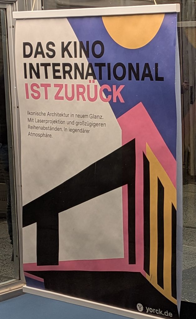 Kino International, Karl-Marx-Allee 33, 10178 Berlin Mitte. yorck.de › kinos › kino-international: Berlins ikonisches Premierenkino … denkmalgeschütztes Kinobaudenkmal … erzählt …, wie am 9. November 1989 Heiner Carows Coming Out Premiere feiert … Der Filmtitel sollte in derselben Nacht Programm für das Schicksal einer ganzen Nation werden. Die Berliner Mauer fällt während der ersten der beiden Premierenvorstellungen. Als die Gäste das Kino verlassen, finden sie sich in einer neuen Welt wieder … [Das Kino] eröffnet … im November 1963 … / [DeepL transl.:] Berlin’s iconic premiere cinema … a listed cinema monument … tells … how Heiner Carow’s Coming Out celebrated its premiere on November 9, 1989 … The film’s title would become synonymous with the fate of an entire nation that same night. The Berlin Wall fell during the first of the two premiere screenings. When the guests left the cinema, they found themselves in a new world … [the cinema] opened … in November 1963 …