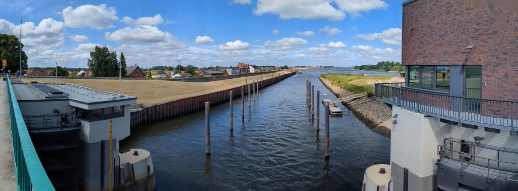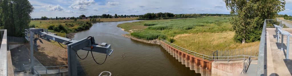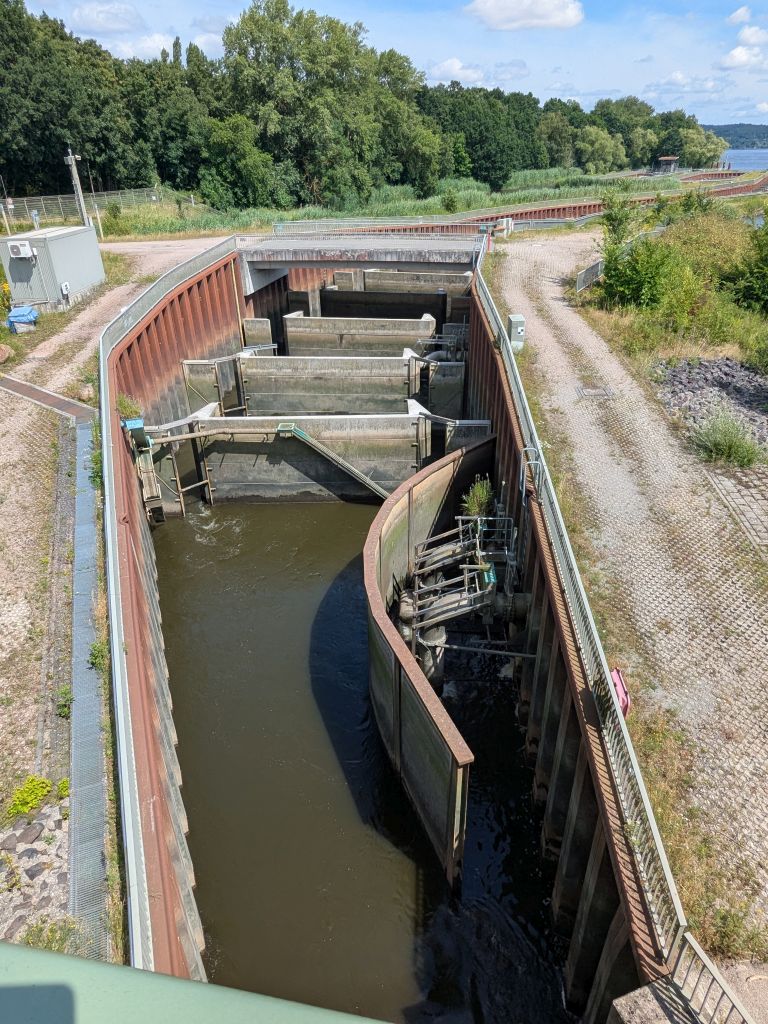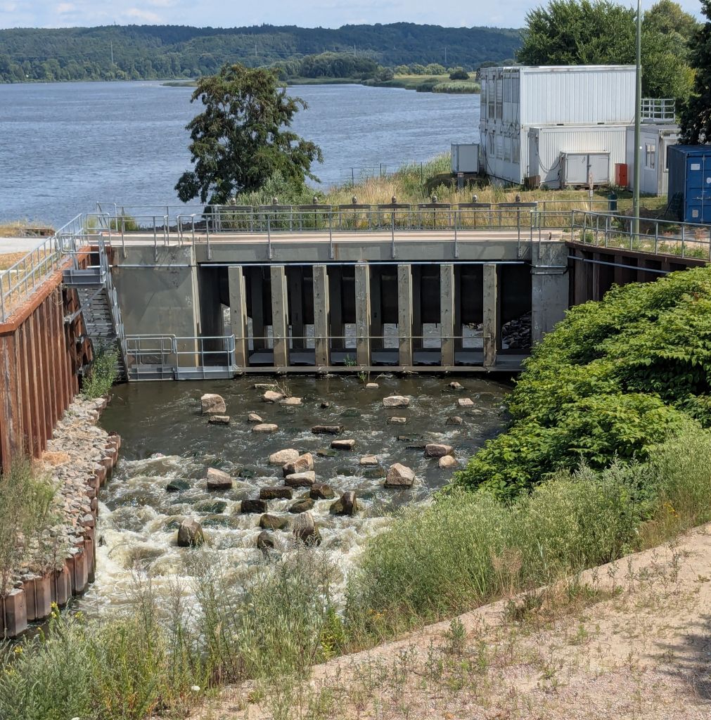 Staustufe Geesthacht, https://de.wikipedia.org/wiki/Staustufe_Geesthacht: 1960 in Betrieb genommene Staustufe … staut das Wasser der Elbe auf 4 m ü. NHN und begrenzt dadurch den Gezeiteneinfluss der Nordsee stromaufwärts … besteht aus einem Wehr mit Fischaufstieg und einem Schleusenkanal mit einer Doppelschleuse … Ein weiterer Fischaufstieg wurde … 2010 fertiggestellt … Der Höhenunterschied zwischen Ober- und dem tidebeeinflussten Unterwasser beträgt im Normalfall zwischen 1,3 und 3,5 Meter. Bei höheren Sturmfluten kann das Wasser weiter stromaufwärts laufen …