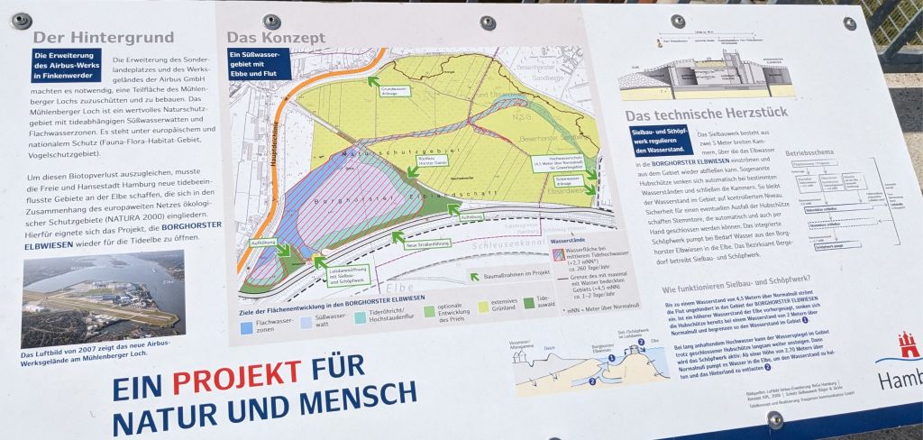 Borghorster Elbwiesen, https://de.wikipedia.org/wiki/Naturschutzgebiet_Borghorster_Elblandschaft: … ein Naturschutzgebiet im Hamburger Bezirk Bergedorf … deckungsgleich mit dem gleichnamigen FFH-Gebiet ….erhielt … 2000 seinen Schutzstatus … besteht aus drei Teilflächen. Die Borghorster Dünen und Elbwiesen … Altengammer Elbwiesen … Borghorster Brack … eine … durch einen Deichbruch entstandene Auskolkung …