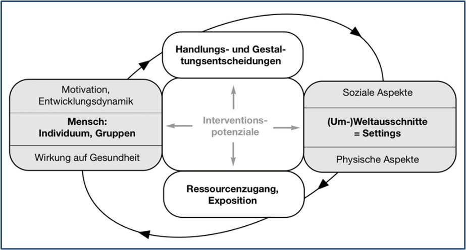 https://doi.org/10.17623/BZGA:Q4-i082-2.0: Zusammenfassung. Ökologie behandelt die Beziehungen von Lebewesen untereinander und zu ihrer Umwelt; Humanökologie legt den Akzent auf die Beziehungen zwischen Mensch und Umwelt. Viele weitreichende Entwicklungen in der Theorie und Praxis von Gesundheitsförderung gründen zu wesentlichen Teilen auf dieser breit und integrativ angelegten (human-)ökologischen Gesundheitsperspektive. Dazu gehören z. B die Ottawa-Charta, die Verbindung von Gesundheit und Nachhaltigkeit sowie aktuelle Ansätze wie One Health, Planetary Health, Global Health und Urban/Rural/Regional Health. Um für die Aufgaben künftiger Gesundheitsförderung möglichst gut gerüstet zu sein, ist es nützlich, die verschiedenen Gesundheitsperspektiven ins Spiel zu bringen, ihre Potenziale zu nutzen und ihre Konsequenzen zu reflektieren / [DeepL:] Summary. Ecology deals with the relationships between living beings and their environment; human ecology emphasizes the relationships between humans and their environment. Many far-reaching developments in the theory and practice of health promotion are largely based on this broad and integrative (human) ecological health perspective. These include, for example, the Ottawa Charter, the link between health and sustainability and current approaches such as One Health, Planetary Health, Global Health and Urban/Rural/Regional Health. In order to be as well equipped as possible for the tasks of future health promotion, it is useful to bring the various health perspectives into play, utilize their potential and reflect on their consequences.