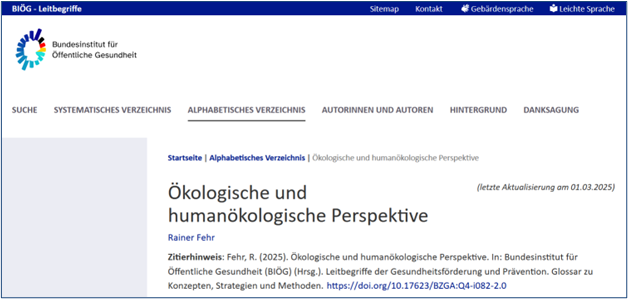 Fehr, R. (2025). Ökologische und humanökologische Perspektive. In: Bundesinstitut für Öffentliche Gesundheit (BIÖG) (Hrsg.). Leitbegriffe der Gesundheitsförderung und Prävention. Glossar zu Konzepten, Strategien und Methoden. (In German / Most recent update: 1.3.2025).