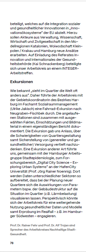 In Hamburg bestehen gute Voraussetzungen für die Entwicklung einer Gesunden Stadt … Die Grundlage für eine nachhaltige und gesunde Stadtentwicklung, die im Einklang mit den 17 Nachhaltigkeitszielen der Vereinten Nationen steht, wurde gelegt. Seit Ende der 1990er Jahre entwickelt sich die Stadt rasant. Neue Stadtquartiere werden gebaut, bestehende Quartiere … werden systematisch weiterentwickelt. Allerdings findet der Aspekt “Gesundheit” kaum Erwähnung in aktuellen Stadtentwicklungsprozessen oder Einzelplanungen / Hamburg has good prerequisites for the development of a healthy city … The foundations have been laid for sustainable and healthy urban development, in line with the 17 Sustainable Development Goals of the United Nations. The city has been developing rapidly since the end of the 1990s. New urban districts are being built, existing districts … are being systematically developed further. However, the aspect of “health” is hardly mentioned in current urban development processes or individual plans.