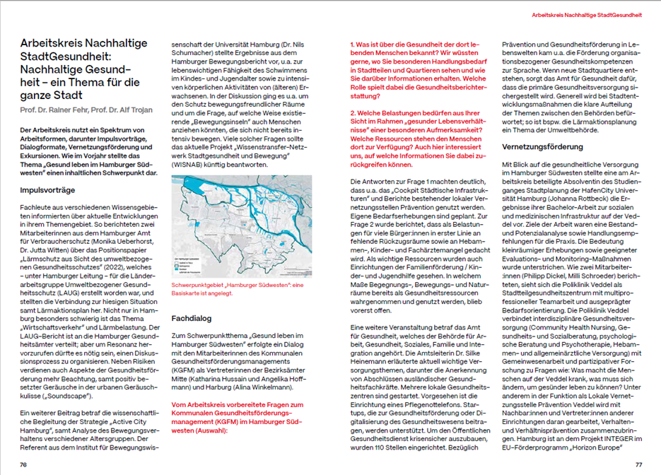 Aus der Ankündigung / From the announcement: Der Arbeitskreis “Nachhaltige StadtGesundheit” befasst sich mit der Umsetzung aktueller Initiativen für eine Gesunde Stadt und für Gesunde Quartiere im Hamburger Raum und erarbeitet Handlungsempfehlungen im Sinne des Ansatzes “Gesundheit in allen Politikfeldern” (Health in All Policies, WHO) / The “Sustainable Urban Health” working group deals with the implementation of current initiatives for a healthy city and healthy neighborhoods in Hamburg and develops recommendations for action in line with the “Health in All Policies” approach (WHO).