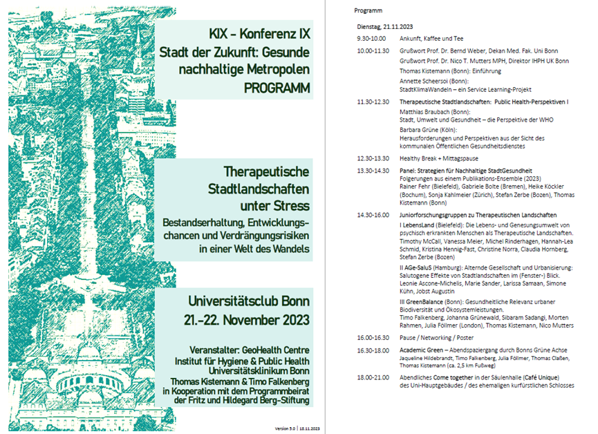 - Vortrag: Wege zu einer gesundheitsfördernden Stadtentwicklung / Lecture: Pathways to health-promoting urban development – Dr. Thomas Claßen, Referent für Gesundheit und Planung, Landeszentrum Gesundheit Nordrhein-Westfalen (LZG.NRW)