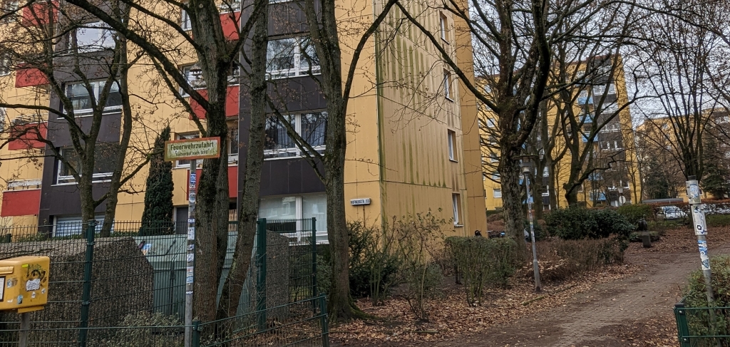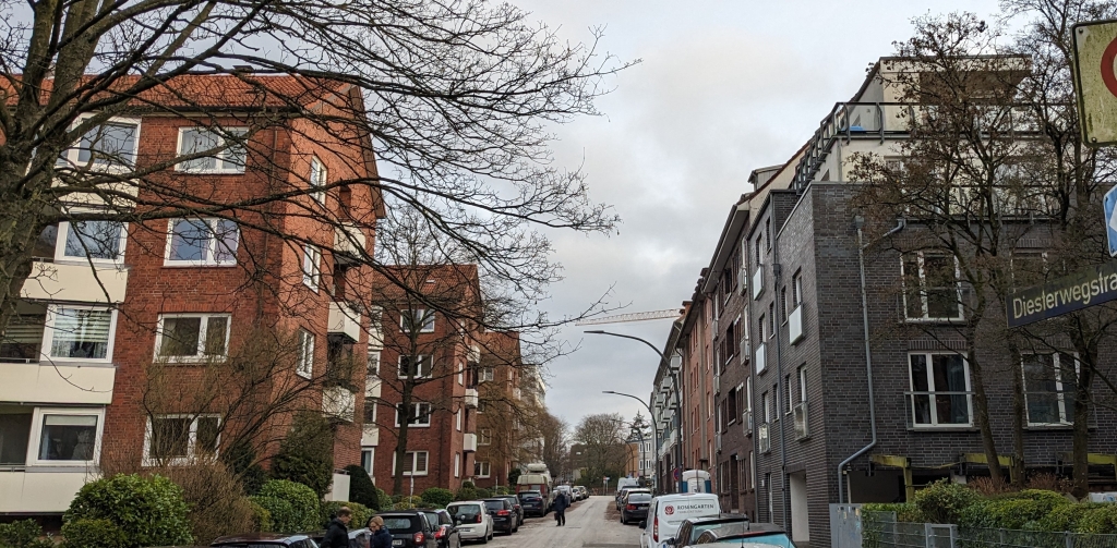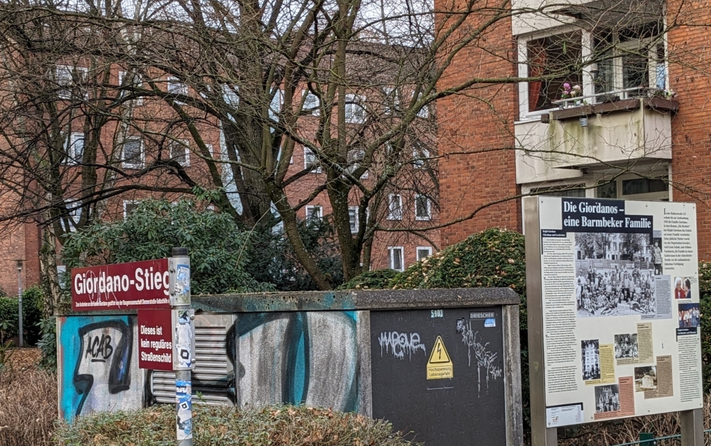 - p.11ff Kap. 1: Heimat Lindenallee. Erste Station – Die nördliche Hufnerstraße samt Nachbarschaft. p.16 In der Hufnerstraße 113 wohnten die Bertinis, und dort wohnten tatsächlich die Giordanos … Im Eckhaus … Drögestraße/Hufnerstraße (Nr. 110) wohnte Leas Mutter Recha … – p.38 1944 … Unterkommen … in der … „Düsternstraße“, d.h. der Diesterwegstraße … Keller unter der Ruine …